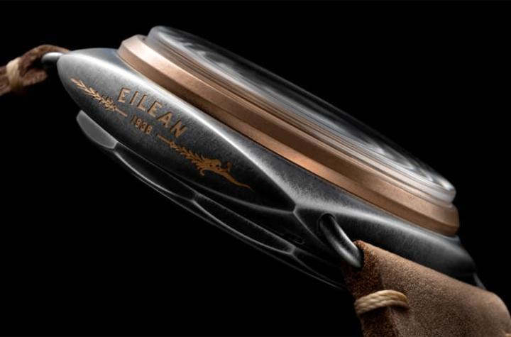 由两种材质构成的表头,搭配沛纳海配置的深棕色皮革表带尽显优雅绅士风范,值得一提的是,表带上还压印纪念 Eilean号首航年份1936的图案,借以彰显出手表与Eilean号帆船之间的渊源。同时若注意到表壳左侧部分,还会发现Eilean号帆船船身代表性的龙形徽章装饰,其以阴刻方式塑形,并填入金色颜料,与表圈的青铜材质也有彼此呼应的味道。