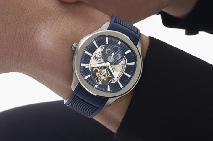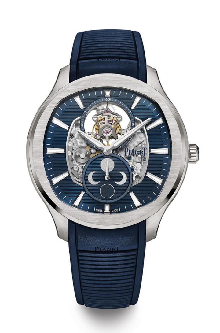 Piaget Polo飞行陀飞轮月相表以钛金属材质搭配真空镀膜PVD技术勾勒出休闲个性,包括它所配置的蓝色橡胶表带也很符合运动休闲手表的定位;手表侧面特别加上了水平凹槽饰纹,并与表冠顶部同样镀上蓝色,与经过缎面拉丝和抛光处理的钛金属表壳与表圈搭配显得优雅率性,然而这款表并非一般的运动风格作品,首先它的表壳厚度9.8mm在运动表中已经显得相对纤薄,再来也很少运动表蕴含陀飞轮加月相这样的复杂功能组合,正是因为身兼两项复杂功能,让它的表壳厚度俨然由纤薄升格为超薄层次。