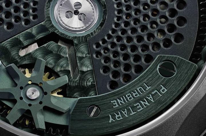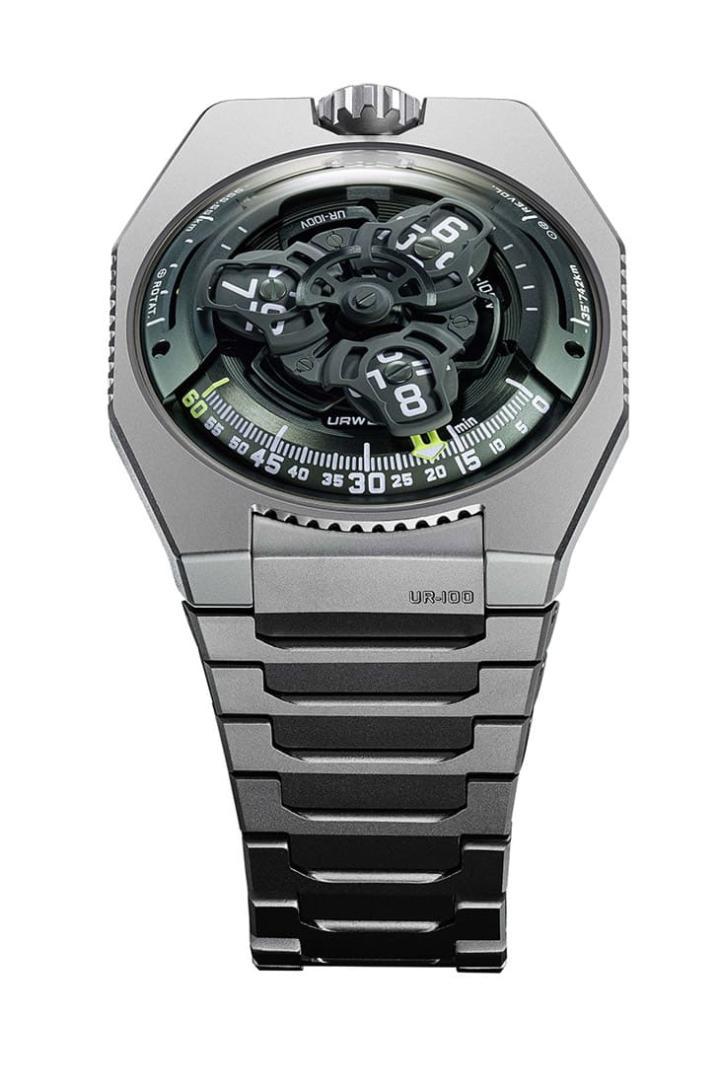 UR-100V Magic T以钛金属制作表壳,新作融入绿色调之后又衍生出独特个性,URWERK创办人之一兼首席制表师Felix Baumgartner表示他们在研发手表采用的金属灰绿色时过程媲美制作仿古董铜绿般讲究,这种绿色不仅可以让视觉深度更臻立体,也不会太锋芒必露导致抢走钛金属表壳与链带的手表基础轮廓。