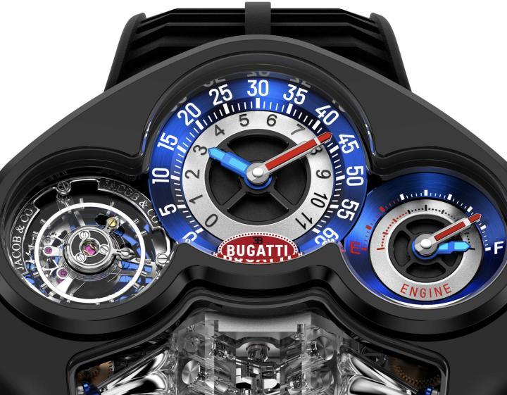 表盘最上方布局灵感来自 Bugatti Tourbillon 超级跑车的仪表盘——左侧为30秒飞行陀飞轮;中间为逆跳时分盘,6点位置印有 Bugatti 品牌铭文;右侧为动力储备指示盘,红色指针指示发条盒动力,蓝色指针指示机巧结构动力。