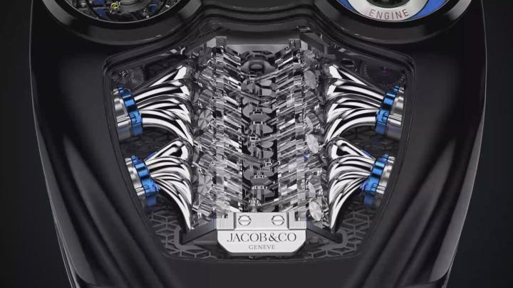 表盘最引人注意的无疑是中央的机巧装置——一个微缩版 Bugatti Tourbillon V16 16缸引擎。按下表冠启动后16个微型“活塞”和“曲轴”此起彼伏,4个“涡轮机”也缓缓旋转,视觉效果令人印象深刻。