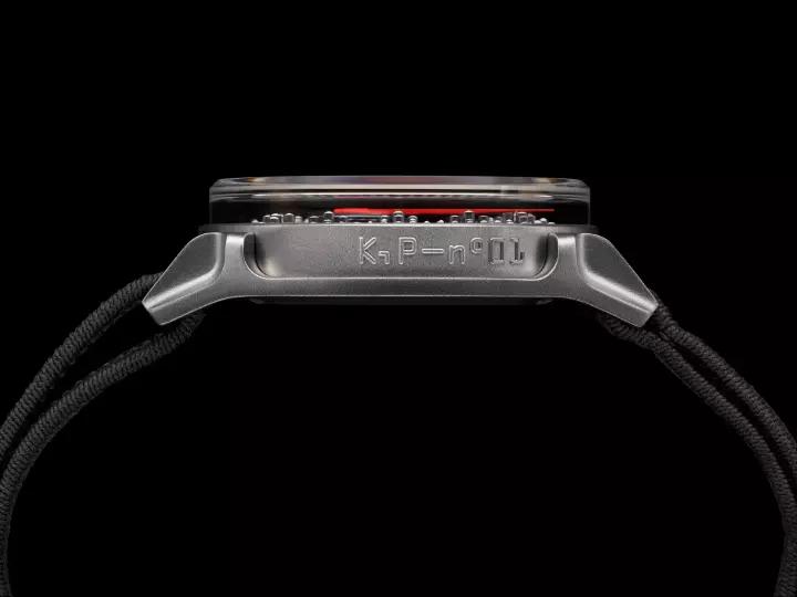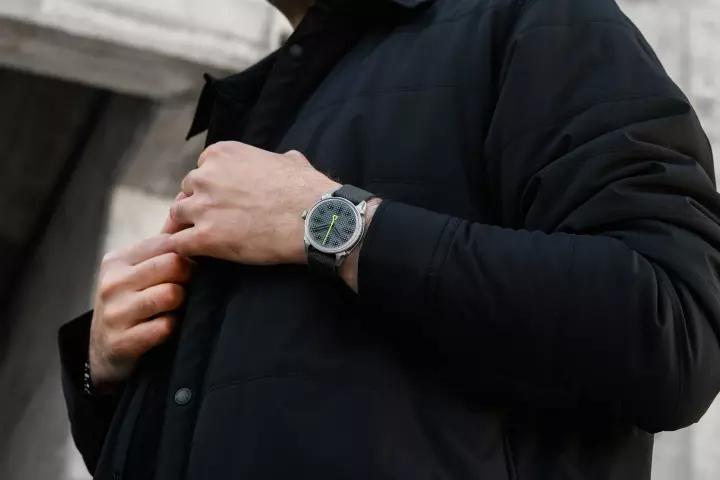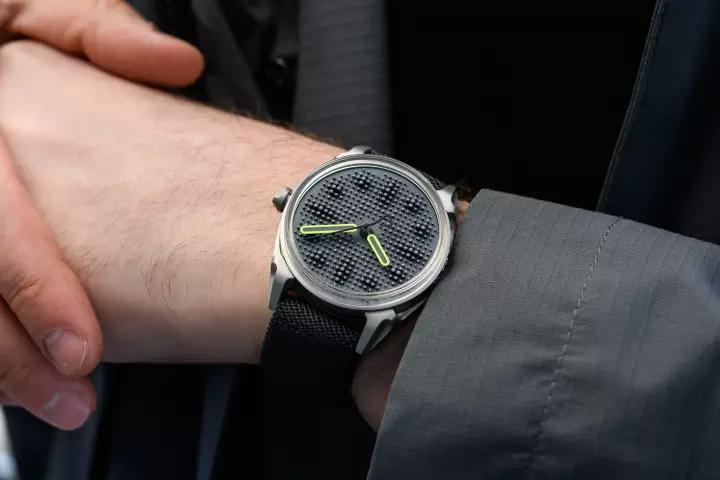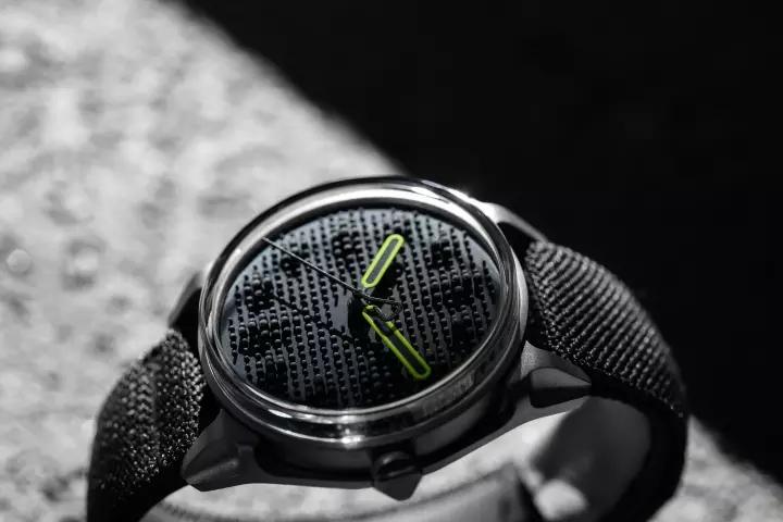 这款腕表的核心,是对佩戴体验的精密考量。表壳虽然外观粗犷,但尺寸却经过细腻调整——40 毫米的表径,38.5 毫米的中层表壳,搭配 11 毫米的厚度(其中蓝宝石水晶玻璃占了近一半),让腕表既有视觉上的存在感,又不会影响佩戴舒适度。Kollokium 为此款腕表特别开发了一体式碳灰色弹性织布表带,其灵感来自户外装备,具备快乾透气特性,并采用单圈设计与钩扣调节系统,使其在不同手腕尺寸间均能轻松适配。