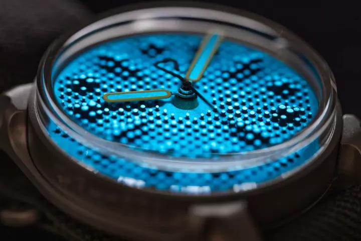 表盘,向来是腕表的灵魂,而在这款作品中,它更像是一场光与影的建筑实验。Kollokium 透过 3D 建模与像素化技术,打造了一款前所未见的立体表盘:基板覆以灰色 Super-LumiNova 夜光涂层,在黑暗中散发冷冽的蓝色光辉,而其上更手工镶嵌了 468 枚黑色 PVD 精钢圆柱时标,错落排列,彷佛现代都市的缩影,亦或一片无声律动的波纹。