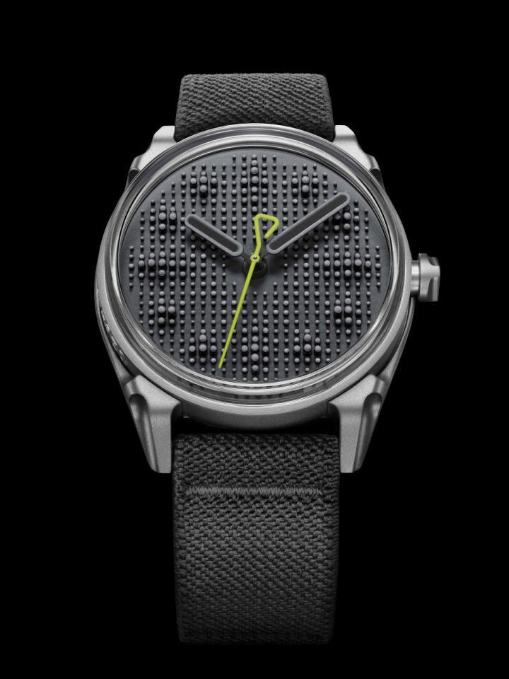 不锈钢表壳/表径40毫米/带纹理的灰色表盘基板/搭配蓝色 Super-LumiNova 夜光涂层/镶嵌 468 枚黑色 PVD 镀层圆柱形时标/覆以灰色涂料与蓝色 Super-LumiNova 夜光涂层/萤光黄色时针与分针与黑色秒针/La Joux-Perret G101 自动上链机芯/动力储能68小时/圆柱形蓝宝石玻璃表镜/阀门造型表冠/防水50米/碳灰色弹性织布一体式表带/搭配压铸钢制钩扣/限量499 只/建议售价:¥ 27,400。