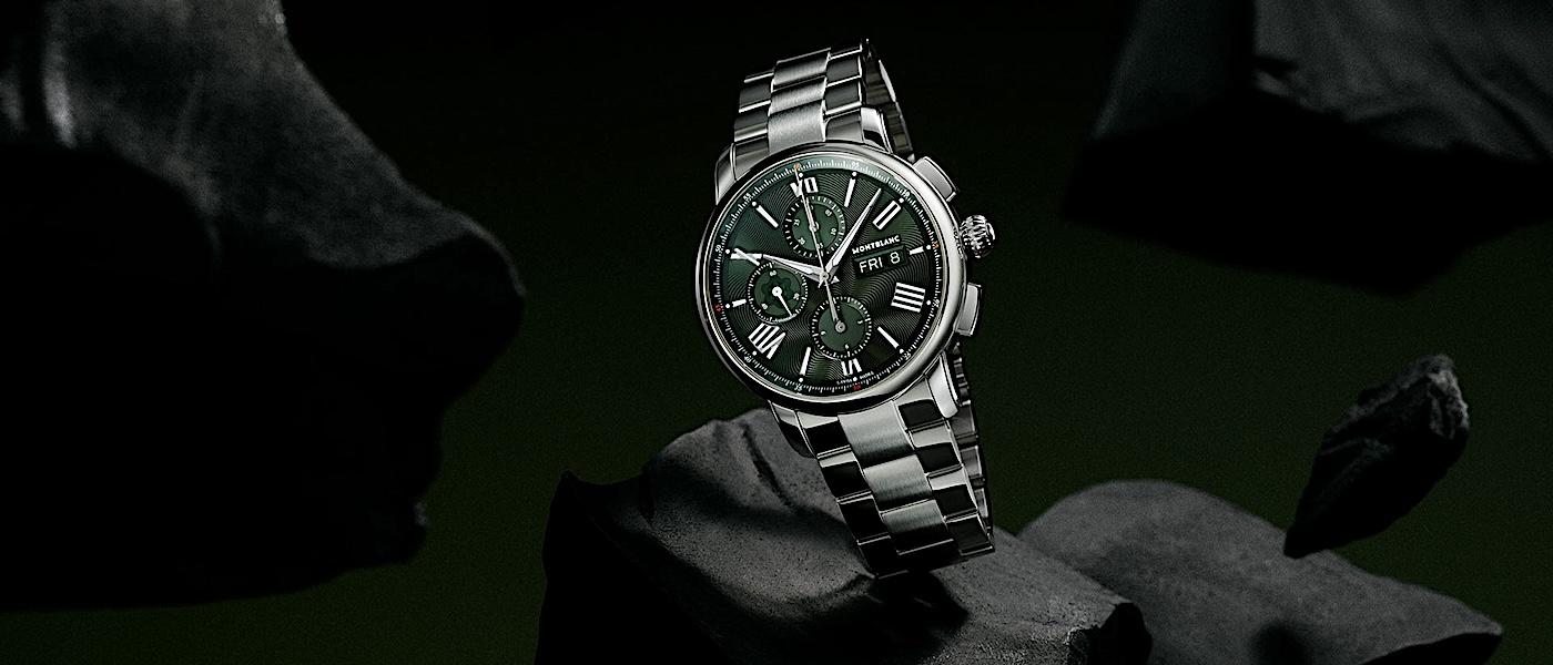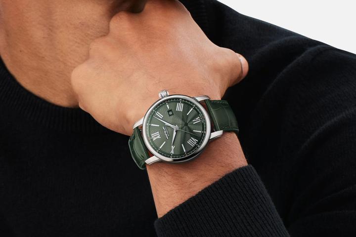 两款腕表防水性能均高达50米,并配备Montblanc的可替换表带系统,可选择不锈钢表链或是缀以米白色缝线的绿色小牛皮鳄鱼皮纹表带。