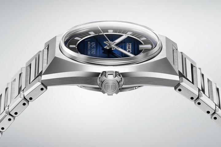 至于新款VANAC的表壳,Seiko将系列原先强调多稜角的设计,融入了时下热门的运动表风格。大面积的切面搭配锐利的线条,就像是由整块金属削切而成,搭配表面两边的最大切面采全镜面抛光,闪亮无比。在上下两端,短表耳的结构又让链带像是直接从表壳延伸出来一样,链带本身的结构也延续了表壳金属削切的凌厉感,尤其是中央链节呈现金块一般的形状。当然,链带的内面是完全平坦的,佩戴起来丝毫不扎手。