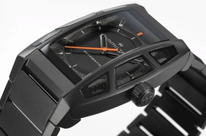 手表面盘与外观同样以黑色调为主轴,其矩形中带有圆形轮廓已经颇为特别,搭配银灰色时标、镂空指针和品牌Logo与字样等,同样很有末日情境般的灰暗感,汉米尔顿巧妙运用橘色点缀12点方向的时标以及秒针,这种亮色系在手表黑化的设计中格外抢眼,也似乎为人带来一丝希望,同时也可以提升手表的视读效果,一举两得。