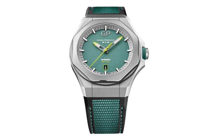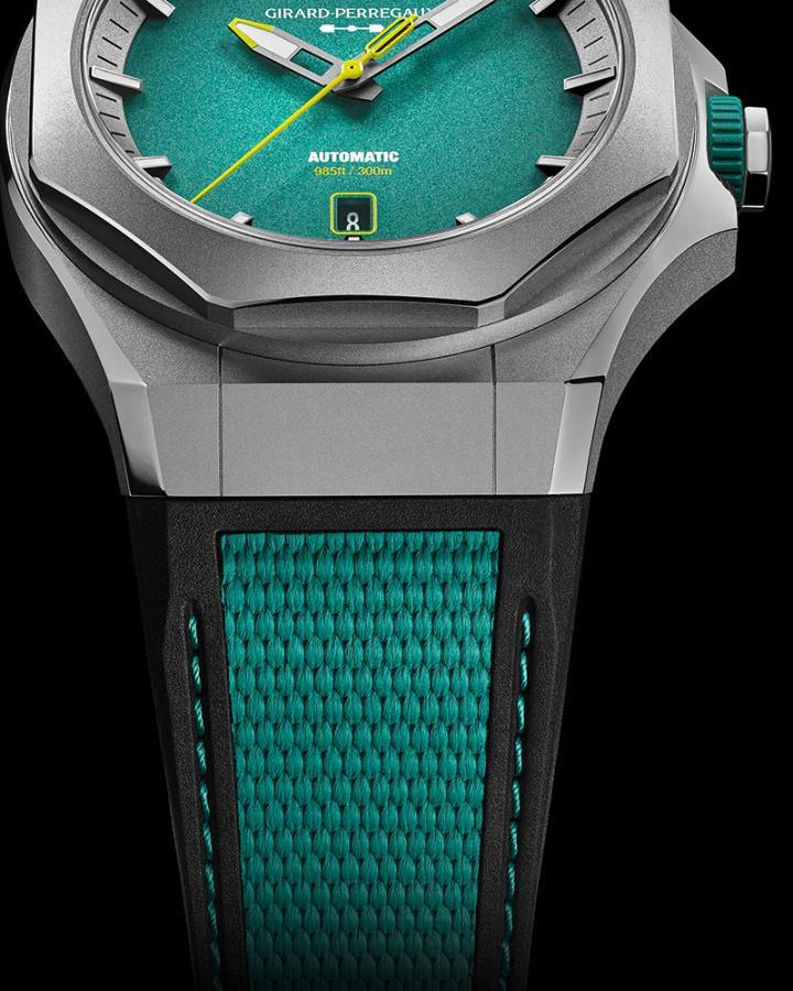 绝对桂冠腕表阿斯顿马丁F1®限量款的表盘颜色,采用阿斯顿马丁竞赛绿(Aston Martin Racing Green)。时针和分针采用部分镂空设计,灵感来自阿斯顿马丁公路车(其标志性跑车DB12)所广泛采用的进气格栅。指针与时标涂覆以夜光材质,确保在低光源环境下也能清楚读取时。腕表的中央秒针和日期显示均采用阿斯顿马丁F1®赛车专用的淡黄绿色。
