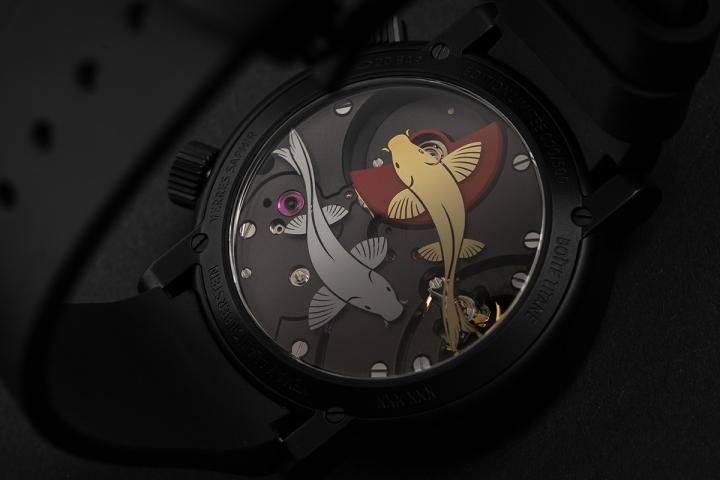 蓝宝石玻璃底盖展示了CMM.20微型自动机芯的内部运作。黑色电镀装饰板桥和红色摆轮营造出现代而独特的美感。充满象征意义和俏皮感的锦鲤图案创造了一款独特的可穿戴艺术腕表,带来宁静和平静的元素,与表盘的大胆色彩和几何形状形成鲜明对比。宁静与充满活力的艺术性之间的平衡使这款腕表充满活力,唤起锦鲤的优雅和坚持,同时以萧伯斯坦的标志性天赋捕捉水下优雅的姿态