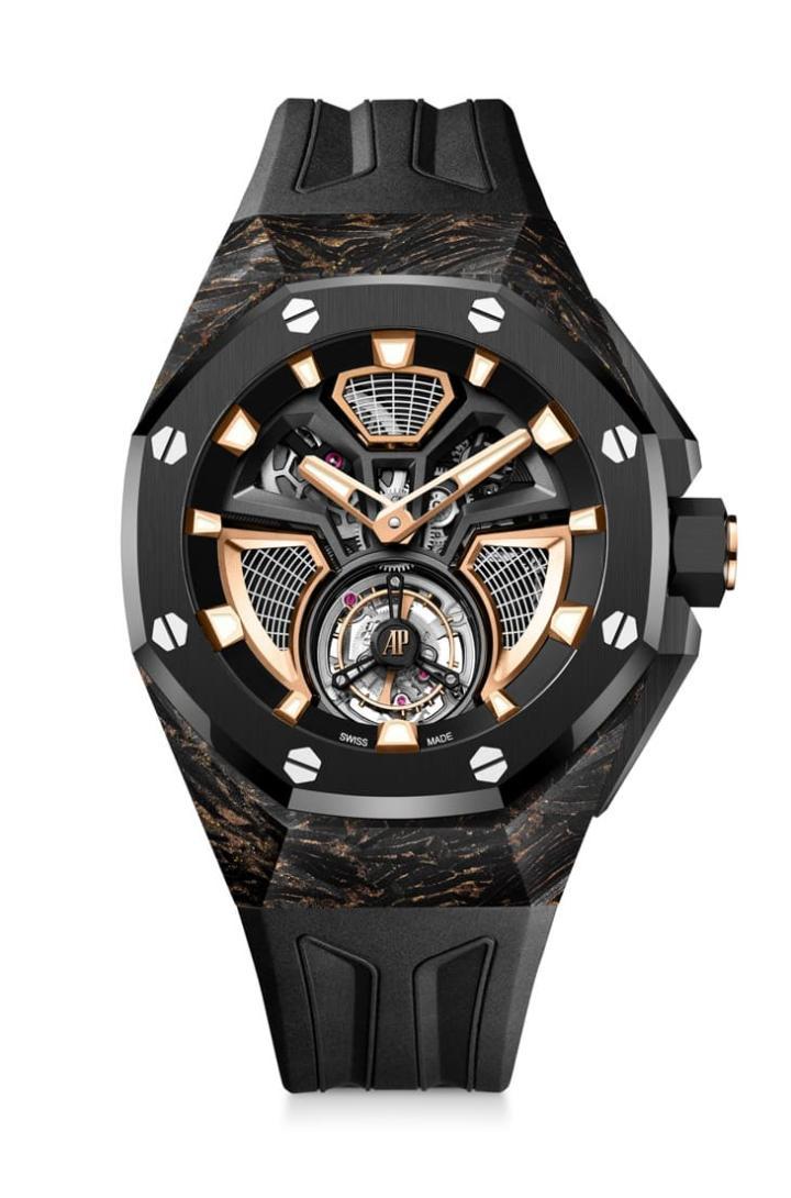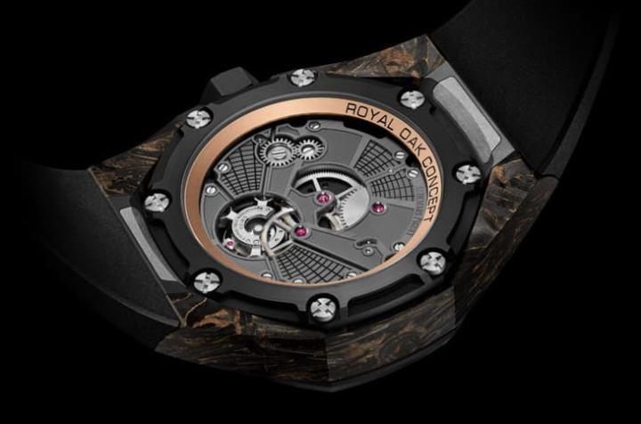 爱彼收集中东收藏家意见后,催生出限定中东地区发售的皇家橡树概念飞行陀飞轮特别版,其表壳以新颖的CFT锻造碳材质制成,不规则纹理中带有玫瑰金色调。