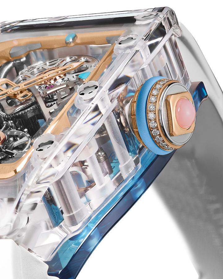 蓝宝石水晶的通透特质使机芯结构尽收眼底,这一特质在RM 75-01飞行陀飞轮蓝宝石水晶腕表中尤为惊艳。RICHARD MILLE是第一个发掘蓝宝石水晶的潜力,并掌握了将其应用在整个表壳工艺的品牌,利用合成蓝宝石水晶雕琢表圈、中层表壳与底盖三部分。