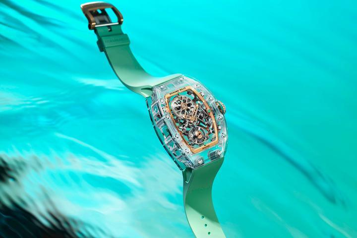 全透明蓝宝石水晶款式的表壳如波光粼粼的海面,海绿色橡胶表带则隐喻海底幻境与热带沙滩的温柔梦境。另外两款作品则以透明蓝宝石水晶表壳搭配彩色蓝宝石水晶底盖,一款为淡紫色调,令人遥想南太平洋的氤氲暮色;另一款则为蔚蓝色,唤起人们对海底斑斓色彩的遐想。蓝宝石表壳以其坚韧的晶体结构,兼具功能、美学与感官体验。其表面温润如玉,佩戴时传递舒适暖意。这一材质凝聚尖端工艺,是珍贵与创新的化身。