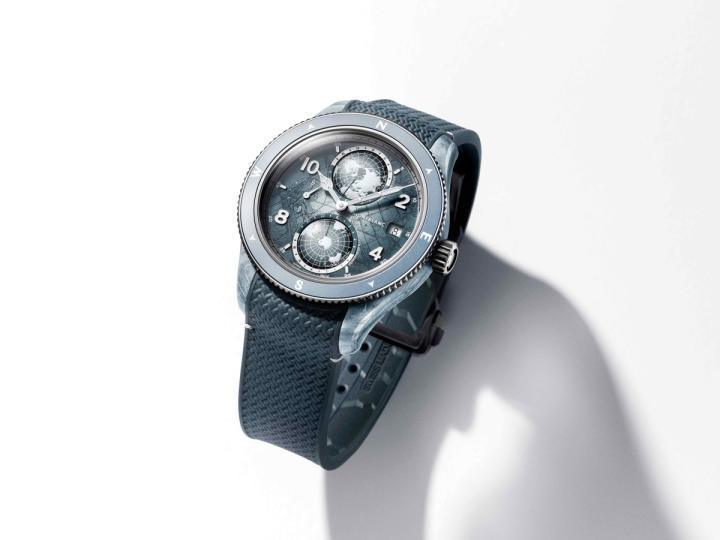 新款腕表采用了43.5公厘的钛金属表壳,并且搭配了一种全新的复合材质表壳中层,这种材料由石英纤维、镀铝玄武岩纤维、碳酸钙及浅蓝色树脂构成,呈现出如南极洲古老冰川般的色彩和纹理,充分表现了冻结千年的冰晶体纵横交错的形态。这样的设计不仅美观,还具备实用性,特别是表壳左侧的文森峰轮廓,白天发出白光,夜晚则发出蓝光,增加了整体的可视性。