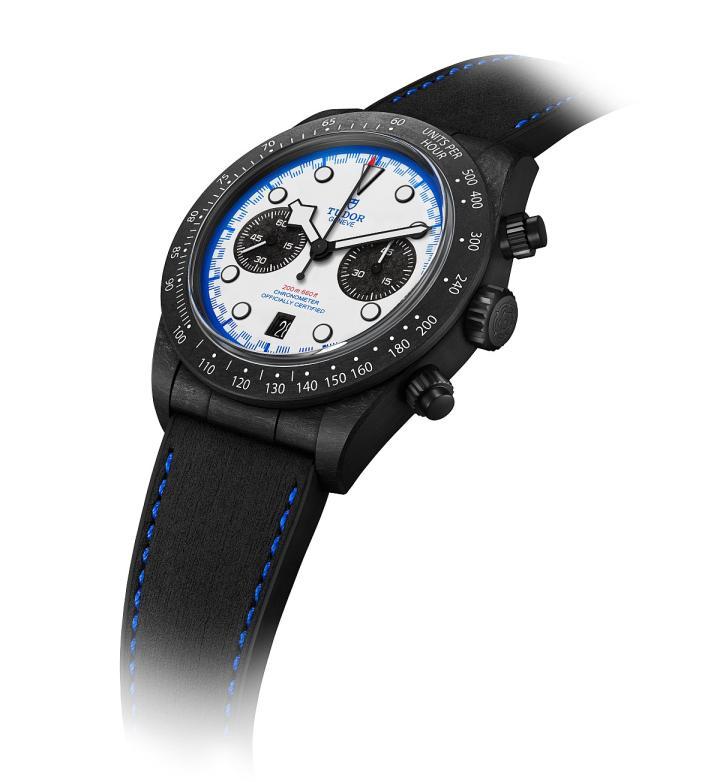 碳纤维表壳/表径42毫米/一体式碳纤维固定测速计外圈/经PVD处理的钛金属旋入式按钮/位于2点钟及4点钟位置/圆拱形极速白表面搭配夜光黑色计时盘/时、分、小秒针、日期、计时码表/帝舵表原厂机芯MT5813型/动力储备 约70小时/瑞士官方天文台认证(COSC)/圆拱形蓝水晶镜面/防水200米/装饰轮胎花纹的皮胶合成表带/型号79377KN/建议售价:¥ 56,600。