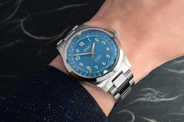 今年全新的Big Crown的指针式日期腕表,格局进行细部调整,表径设定在40 毫米,日期指针从过去的Y型叉改变为箭头,阿拉伯数字时标改为立体镶贴,视觉层次更立体。与作品搭配的链带,则采用Oris特地开发的H型链节。至于Studer所说的新色彩,绝对是改款的最大亮点。