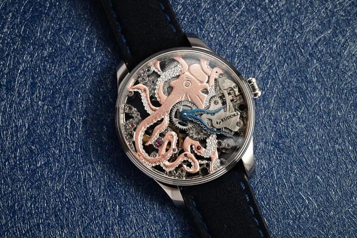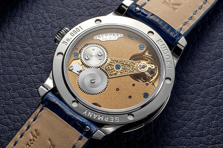 Kudoke 自制的 Kaliber 1-24H 手动上链机芯驱动,具备 46 小时动力储存。机芯灵感源自英国历史怀表,并经由 Kudoke 对镂空设计的精湛掌握而臻于完美。其装饰细节包括抛光边缘与精致雕刻零件,皆由手工完成,透过蓝宝石水晶底盖展现极具吸引力的机芯结构。这种结合技术精准与艺术修饰的手法,体现了 Kudoke 将制表视为可佩戴艺术的理念。