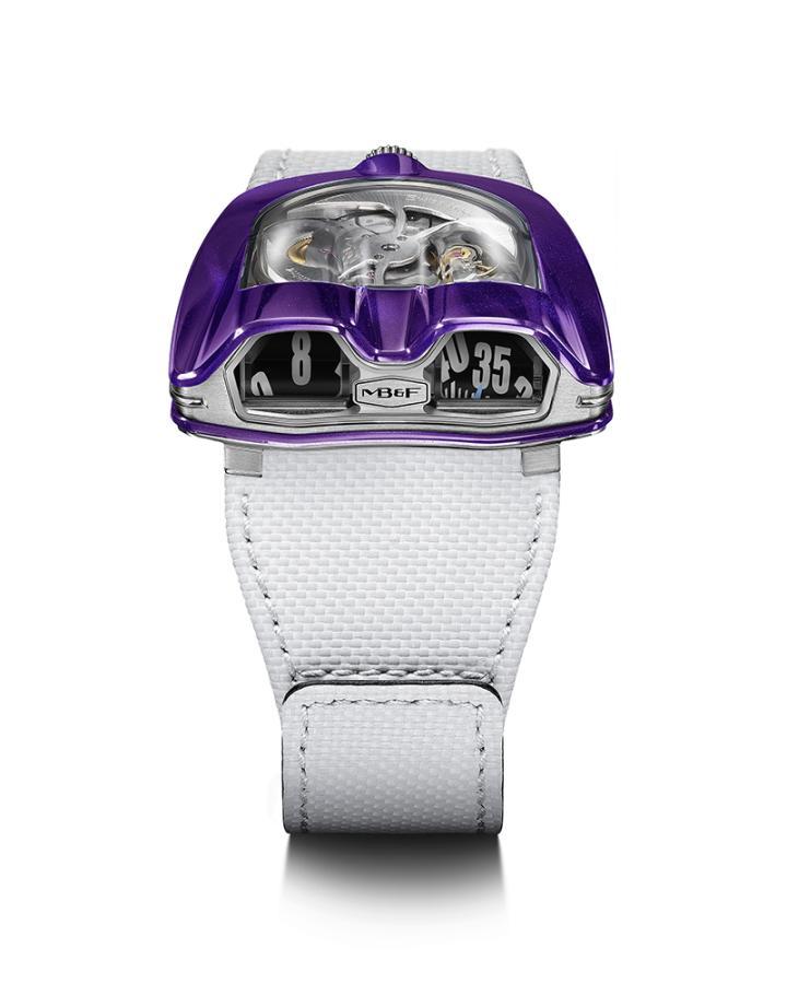MB&F HM系列腕表不只设计语汇深受汽车影响,结构也是。工程背景的Maximilian可说是学以致用!HM5与HM8 Mark 2采用独立防水底盘再组装上车体;HMX与HM8则是一体成型。第一代HM8 Mark 2的CarbonMacrolon®车体有白色或英国赛车绿两种,结合雾面车顶与高抛光侧板。白色款搭配绿色CVD镀膜自动盘与浅绿色分钟刻度;英国赛车绿款搭配玫瑰金自动盘与平衡摆轮,以及青绿色分钟刻度,限量生产33只。继2023年首发后,MB&F决定再以一款蓝色腕表向汽车工业致敬;紧接着2025年紫色版亮相,两款皆限量33只。