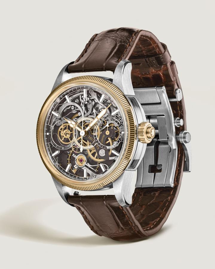 此腕表配备43毫米不锈钢表壳,表面经过优雅的横向缎面刷纹处理,并搭配18K黄金凹槽纹表圈,灵感来自Minerva表厂于1927年推出的首款凹槽纹表圈。