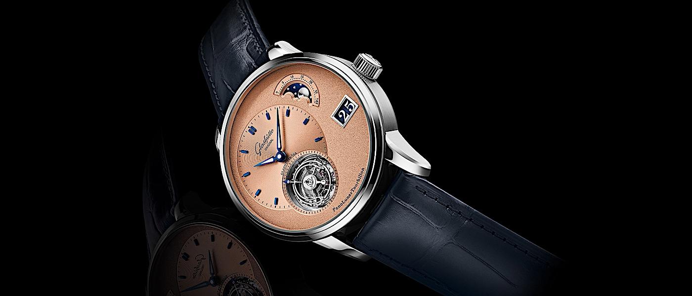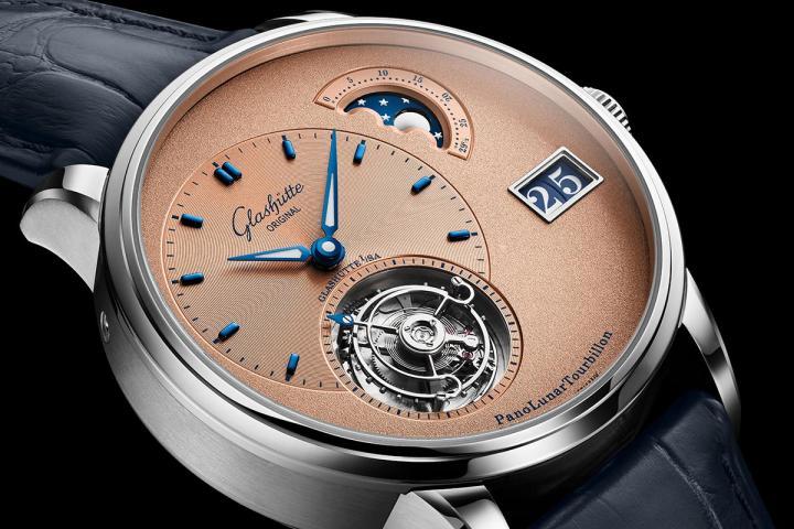 这款全新时计延续了偏心系列标志性的不对称表盘布局。整体视觉设计遵循黄金比例,展现出极致平衡与和谐。在格拉苏蒂原创特有的设计语言中,偏心月相陀飞轮腕表巧妙地将经典元素与前卫风格融为一体。40毫米铂金表壳采用抛光与缎面打磨处理。玫瑰金色表盘巧妙融合蓝色元素,包括蓝钢指针、印刷字样、纯金时标、大日历背景以及月相显示背景,每一处细节都展现匠心巧思,彼此相互呼应,和谐一致。腕表可搭配深蓝色路易斯安那鳄鱼皮表带或尼龙编织表带,均配备铂金折叠扣,演绎传统工艺与现代设计的精彩对话。