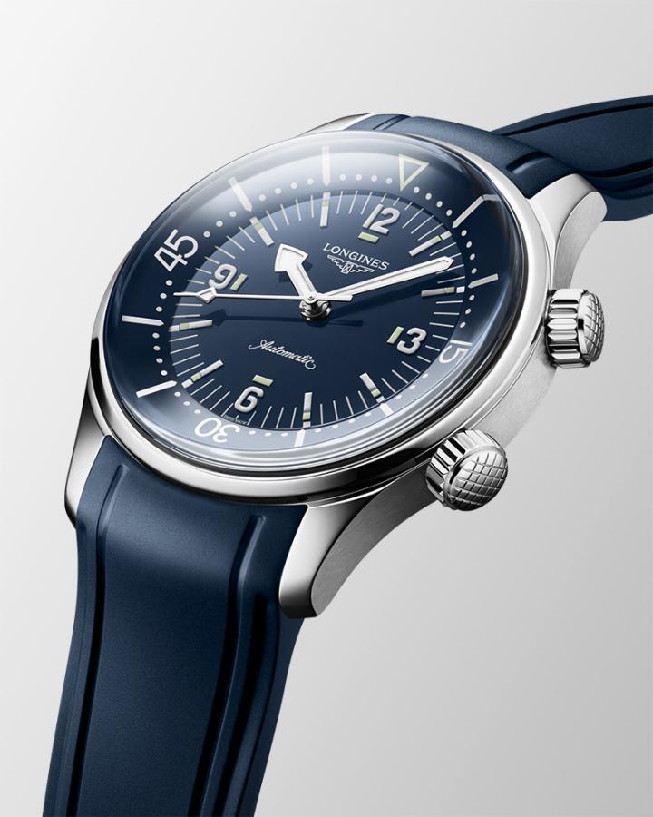 本次推出的三款腕表皆配置直径39毫米不锈钢表壳以及抛光与缎磨交错装饰。内侧双向旋转表圈(浪琴于1936率先推出的革命性功能)依然在表壳内部获得保护,并由位于2点钟方位的旋入式表冠负责操作。表圈具备沿着边缘逐渐增加数字的60分钟刻度,于顶端12点钟方位设置一个萤光三角形标志。Legend Diver的内侧双向旋转表圈设计不仅延续最初表款的传承,更提供防止意外操作或震动的实用保护效果。