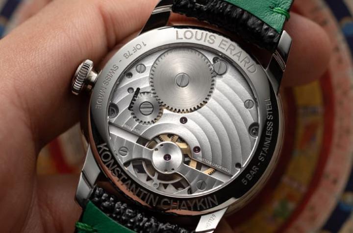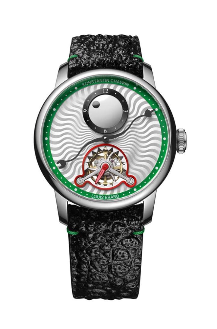 手表采用42mm抛光不锈钢表壳,结构简洁,为面盘上抢眼的戏剧腾出舞台,搭配双面抗反光蓝宝石玻璃镜面、透明底盖,细节处处为观赏这只怪兽而设。手表提供绿色与蓝色两款版本,各具风格,其中LOUIS ERARD以亮绿色分钟圈为主轴,限量78只;KONSTANTIN CHAYKIN发行的蓝色版则限量28只,更显稀有。两者皆搭配快拆表带,分别使用蟾蜍皮与粒面小牛皮,内里选用兔皮或柔软牛皮,触感舒适、质感到位,连细节都与主题呼应。