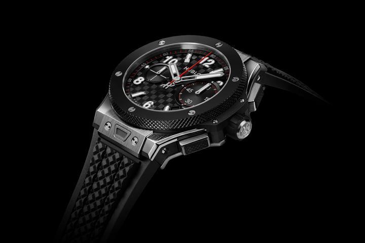 钛金属表壳/陶瓷表圈/表径43毫米/碳纤维立体浮雕纹理表盘/时、分、小秒针、日期、飞返计时/HUB1280自动上链机芯/动力储存72小时/蓝宝石水晶玻璃镜面及底盖/防水100米/橡胶快拆表带/限量500只/参考售价:¥ 154,800。