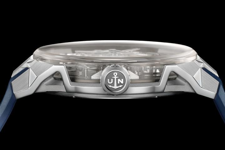 18K白金表壳/表径45毫米/德国银表盘/时、分、飞行陀飞轮、动力储存显示/UN-176手动上链机芯/动力储存7日/蓝宝石水晶玻璃镜面及底盖/防水30米/橡胶表带/限量50只/参考售价:¥ 929,000。
