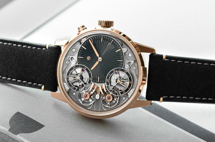 18K 玫瑰金材质/ARF21 手动上链机芯/时、分、双小秒显示/蓝宝石水晶镜面、透明底盖/防水 30 米/表径 43mm/限量 15 只/参考价:¥ 869,600