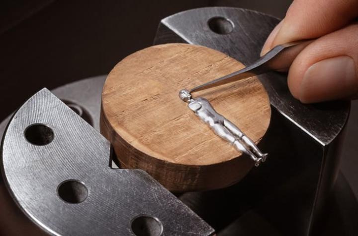 当佩戴者选择静待模式,人偶双臂会自然垂下,时间在 "后台" 默默流动;按下 10 点钟方向按把后,双臂会同步抬起,瞬间展现精准时间,这项专利机制以轻盈的钛金属减轻冲击,并确保在 11:59 与 12:00 的切换瞬间,指针能精准同步,克服了传统逆跳常见的不同步问题。