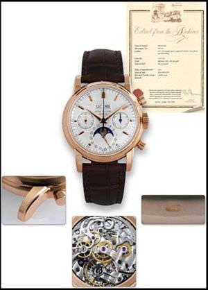 拍卖的焦点是一款极度罕见的Patek Philippe Ref. 2499百达翡丽参考号2499,百达翡丽的第三个系列,在971年制造,在1972年6月14日售出。这款拥有圆形按钮的18k粉色金计时码表带有30分钟计时器、万年历和月相显示。从档案馆里取出它的时候,它装在一个Patek Philippe 百达翡丽盒子里。估价:800’000 - 1’200’000瑞士法郎