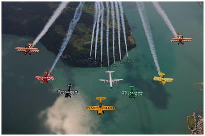 以及Breitling Super Constellation百年灵超级星座号客机(全球最后三架仍具有飞行能力的超级星座飞机之一);由两架橙色波音史提曼双翼飞机组成的Breitling Wingwalkers百年灵空中漫步特技飞行队,机翼上搭载的两位金发美女在飞行过程中表演惊心动魄的空中杂技;由四架Pitts Special S2A飞机组成的Breitling Angels百年灵天使特技飞行队也以全新喷涂的四种色彩炫丽呈现,在百年灵天使飞行队之前领航的则是由王牌特技飞行员Nigel Lamb奈杰尔•兰姆所驾驶的MX2双座式飞机。