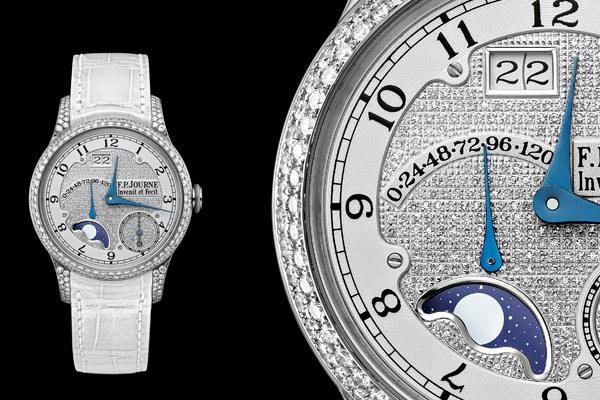 为这两个属于浪漫的节日,推出两款情人表款,Octa Divine铂金腕表,以及Dcta Divine铂金钻表。两款腕表皆为铂金材质,并且具备月相盈亏显示功能,增添奢华高雅。