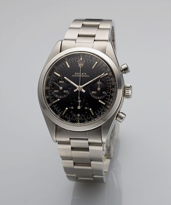 约制于1962年的劳力士Ref. 6238是一款圆形按钮计时腕表,搭配测速刻度圈,常被称为“Pre-Daytona”,有精钢、14k金和18k金版本。出现在安帝古伦上的是黑色表盘精钢款,附有认证书。估价:40,000 –60,000美元。