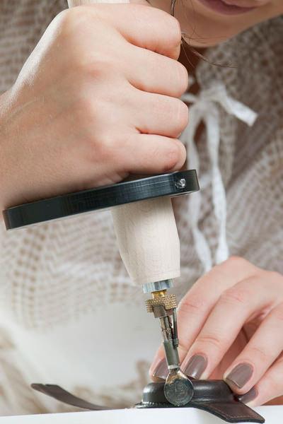 最后是锤打缝线的润饰工序:用特别的小锤敲打每一针缝线,并刻画缝线边缘使缝线的线条更为清晰工整,然后染色并以蜜蜡打磨出光泽。