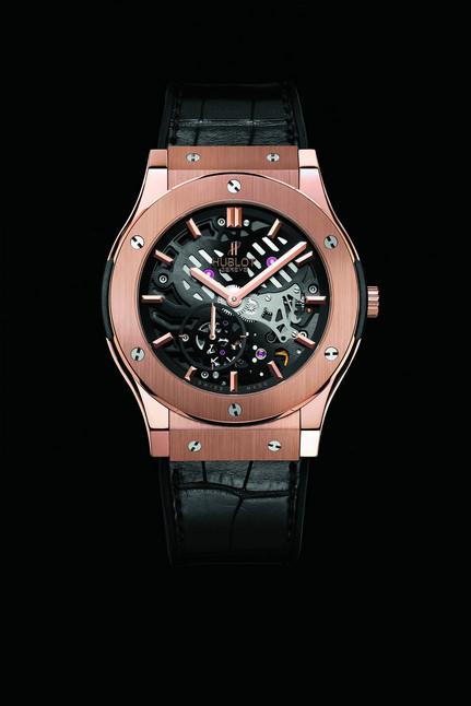 表盘 蓝宝石表盘附加玫瑰金HUBLOT标识,内外侧防反光处理镀玫瑰金嵌花刻度