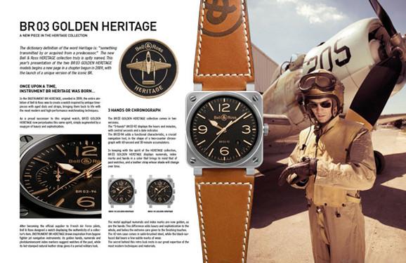 翻查字典, “Heritage”一字解作“传统承传”。Bell & Ross 柏莱士全新的Heritage表款,正好把“Heritage”一字演绎得传神达意。今年Bell & Ross 柏莱士推出两款BR 03 Golden Heritage新作,为2009年首度面世的Heritage系列写下崭新的乐章。