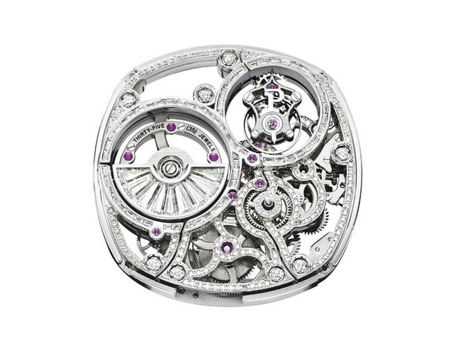 新腕表的机芯及自动摆陀均由长方形美钻铺镶,机芯以14K精金制造,自动摆陀则以铂金铸造,提升转动功效。鉴于铂金较精金柔软,镶钻难度倍增,镶石过程所需技术亦相应提升。