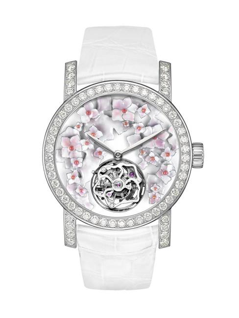 此系列的镶钻白金腕表表盘展示了陀飞轮的机械装置。陀飞轮设于6时位置,并以大明火珐琅艺术为背景及绣球花的花冠作点缀;每朵绣球花均经过雕琢和手工雕刻,花蕊饰有银色铝箔珐琅。表底是一块蓝宝石玻璃,让人观赏内置的CP12V-X手动上链机械机芯 % 上盘及主机板上的绣球花设计。鳄鱼皮表带与针式表扣也饰以白金和镶钻的绣球花,为这些精致的腕表作品添上完美的句点。