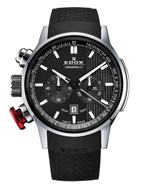 EDOX Chronorally越极速野时尚计时码表,2014全新版是特别为赛车手,爱好速度的朋友而设计的,保有此系列的赛车基本特色 : 测速仪刻度、计时码表和超大日期显示、独具特色的红色大尺寸按钮来自仿赛车引擎启动的设计概念,以铝制红色电镀超大按钮设计放置左边,极具功能性又方便赛车手舒适配戴、轮圈隽刻印在表后底盖、轮胎压纹的橡胶表带等赛车元素。新款除了保留赛车基本特色更添加专业时尚感,以荒野赛车急速时刻引发的尘土为灵感,发想全新铁灰色表盘赋与这款表全新的时尚氛围,有316 不锈钢或PVD黑色包覆两种选项,超大气的45MM 直径显示这款新的越野表具有丰富的车迷的特性,表盘及时尚直条纹的内装呈现了更高层次的触感。