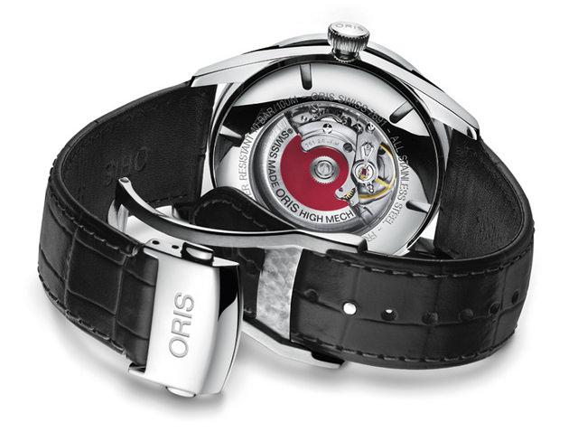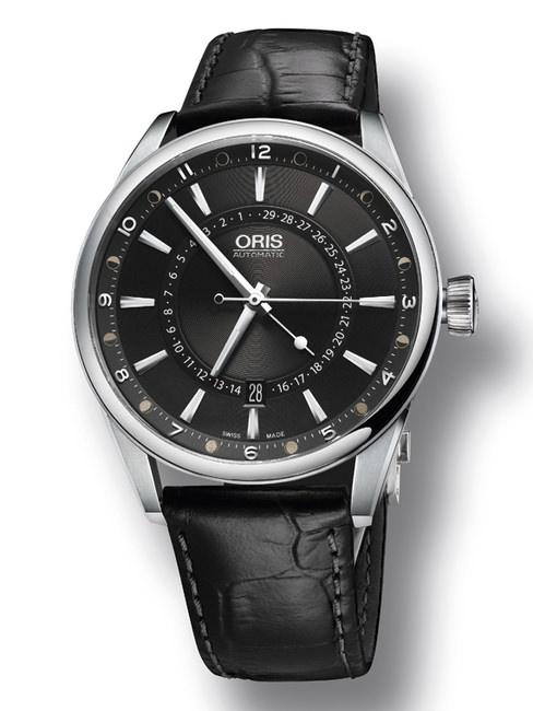 ORIS首度推出拥有此创新功能的腕表,有别于品牌的其他表款,腕表仅以两个相交的时计盘来显示分秒,展现了精湛的制表工艺。银色扭索状饰纹表盘上搭配抛光镀镍刻度及指针,表壳及表冠以多片式不锈钢打造,防水功能达5倍大气压力。优雅的腕表外型配以内外侧球形切割的蓝宝石水晶表镜,做工细致。腕表配备深啡色鳄鱼纹真皮表带,搭配不锈钢折叠扣,更显典雅气质。