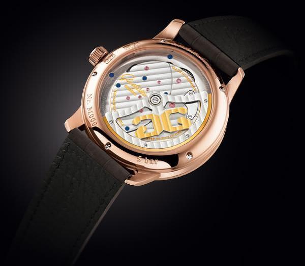 透过表底的蓝宝石水晶可一窥机芯,其中精致的镂空中央自动摆陀配备21k金边,自动陀轨道与经典的装饰纹相得益彰。不对称的表盘设计为双鹅颈微调装置提供充裕的空间,与格拉苏蒂原创偏心系列的特色表盘设计相映成趣。