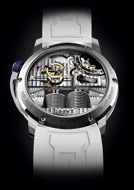 一只结合东西两方、日与黑夜的颜色,很自然地成为了 HYT 液体机械腕表的一员。蔚蓝色的液体增强了腕表的复杂性,同时亦增添了一丝轻盈,散发出新鲜空气的味道。有如冰山般的白色腕表设计带领您探索腕表的超凡机械结构,此让人联想起海洋及天空的蓝色液体,共用上了18个月时间研发,全球限量50枚。