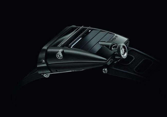 以Horological Machine No.5最突显的特色来说,充满建筑结构美学的棱角表壳,与其灵感来源流线型的超跑外型忠实地相互呼应,但这些尖锐的棱角反而会使黑色PVD涂层比一般传统设计更容易被刮损。所以与其采取简单的方式,在现有的HM5表壳涂上黑色PVD,MB&F则选择去寻找坚实的黑色材料:可以抛光且质感如金属;密实与坚固如金属;如不锈钢般刚硬