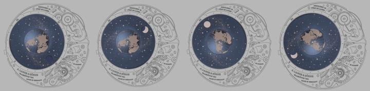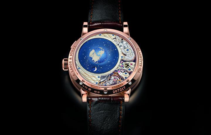透过机芯一面可看到正申请专利的轨迹月相显示,这个首度安装于腕表之中的创新技术装置,展示出月球相对地球和太阳的位置。轨迹月相显示由三个圆盘组成。在繁星密布的天体圆盘上,月球显露于圆形视窗内,每月逆时针围绕地球轨道转动一圈。此装置准确重现有29天12小时44分3秒的朔望月,直至1058年后才需校正一天。其下方为带两个新月的转动月相盘。月相进程可通过天体圆盘的窗口进行观察。在星群图中,摆轮代表太阳的位置。在新月日,暗月会出现于地球和太阳之间。而在地球的另一面则为满月日,显示出明亮的月球。因此,月亮的位置和位相会同时呈现出来。而设于显示中央位置的地球,每天绕着地轴自转一次。面向太阳或摆轮的一面为白天,另一面则为夜晚。外围的24小时刻度用作参考北半球的时间。