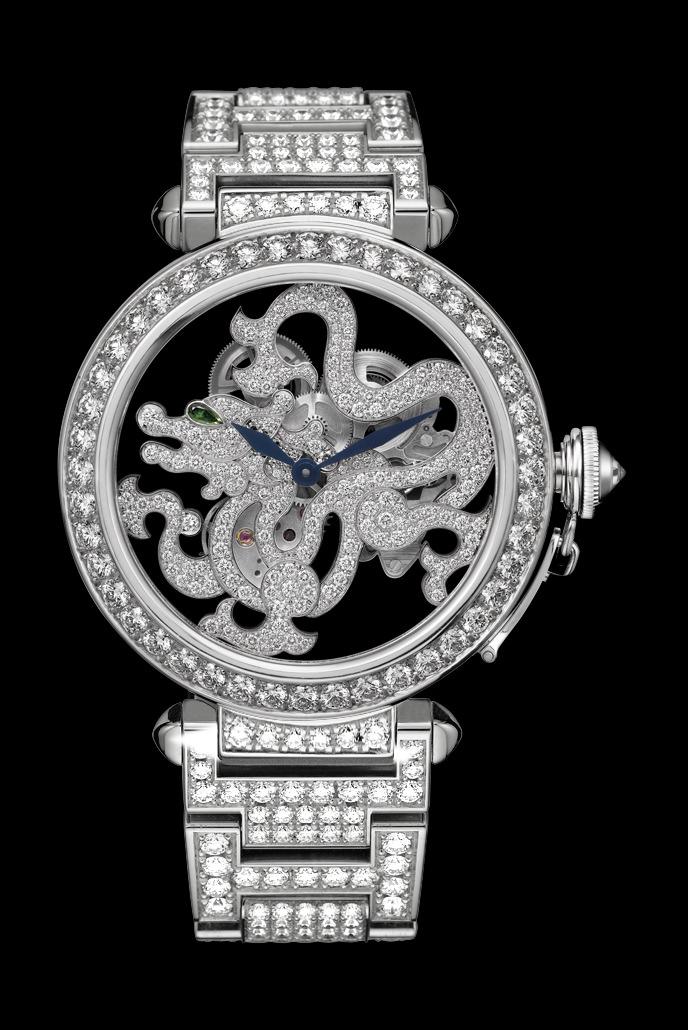 此龙形装饰镂空腕表延承Santos100腕表的罗马数字型表桥所开创的独特工艺,后者将镂空绝技确立为卡地亚表最具标志性的特色之一。