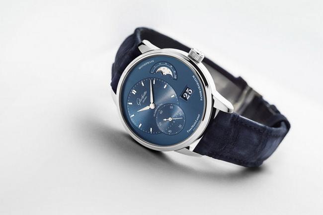 红金款的偏心动力储存腕表采用哑光黑色表盘,映衬出小时和分钟显示窗口的金色指针及涂色时间刻度,白底黑字的大日历显示以及带有金色指针的动力储存指示器。另一款精钢偏心动力储存腕表则以电镀蓝色表盘配白金指针,涂色时间刻度,以及位于动力储存下方的大日历显示——蓝底白字,令人惊艳。偏心动力储存腕表的心脏是手工上链的65-01机芯,动力储备42小时,带有48颗宝石。格拉苏蒂原创特有的双鹅颈微调及其它格拉苏蒂制表工艺的传统元素,包括带有格拉苏蒂柱状纹装饰的四分之三夹板、手工雕刻的摆轮夹板、螺丝摆轮、螺丝固定黄金套筒以及蓝钢螺丝,都可以透过蓝宝石水晶底盖一览无遗。大日历显示、月相显示和动力储存显示都采用德语标识。这些标识与「Made in Germany」标识相呼应,巧妙提示了腕表的来源,对始于1845年的德国制表工艺含蓄地表达了崇敬之情。