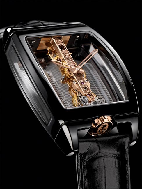 金桥系列35周年志庆,自然少不了男装表款贺礼:今年的金桥男表处处显现CORUM前卫创新思维,从表盘和水晶玻璃的处理可见一二:此新作的水晶玻璃表背经金属化处理,时而半透明,时而在光线照耀下又变得剔透,让金桥腕表变得更富趣味,金属面线条纹理与线型黄金机芯光泽互相辉映;由于没有表盘,自然没有时标,只有琢面指针与直线视觉效果起平衡作用;透过水晶玻璃表镜和表背,CO113机芯的玲珑结构造工一览无遗。