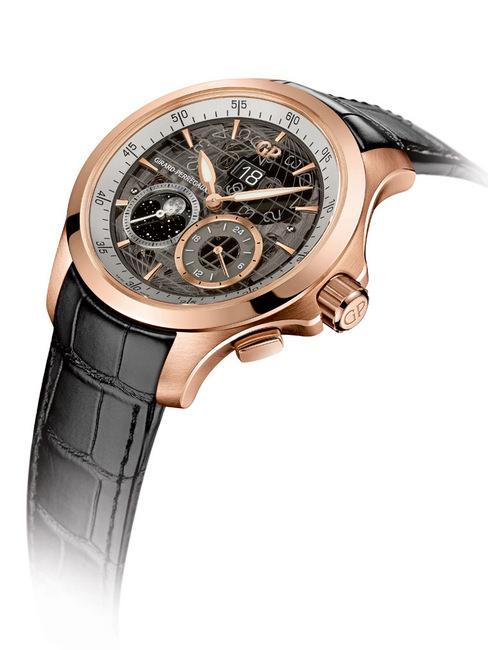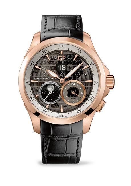 Traveller 大日历月相世界时间腕表首次搭载了透视式表盘。这款最新的Traveller无论是时尚的精钢或翩翩君子的玫瑰金面貌,皆为此新作赋予突出的型格和成熟不凡的气质。腕表高效实用,采用了GP 芝柏表原厂自动上链机械机芯,并提供了大日历、第二时区显示、月系统为GP芝柏表的独家专利技术,由两个重叠的转盘组成,其一为透明数字盘,仅厚0.10毫米。转盘间无明显分隔线,一气呵成,显示简洁秀气。