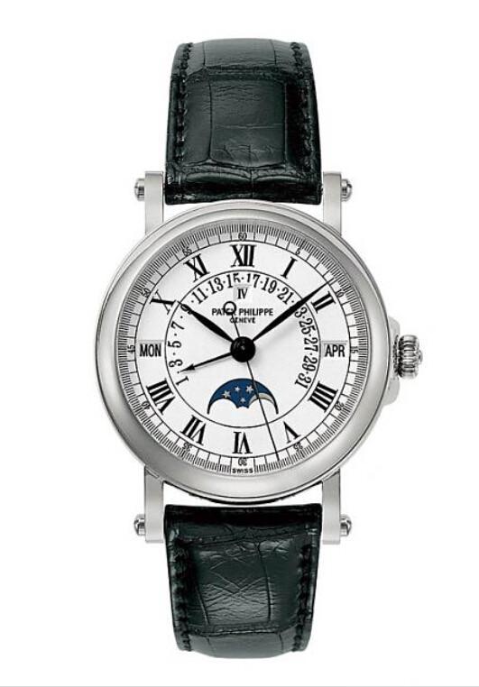 此为品牌首创以逆跳日期显示万年历信息的表款,采用经典的Calatrava表壳,有18K黄金、白金和玫瑰金三款。