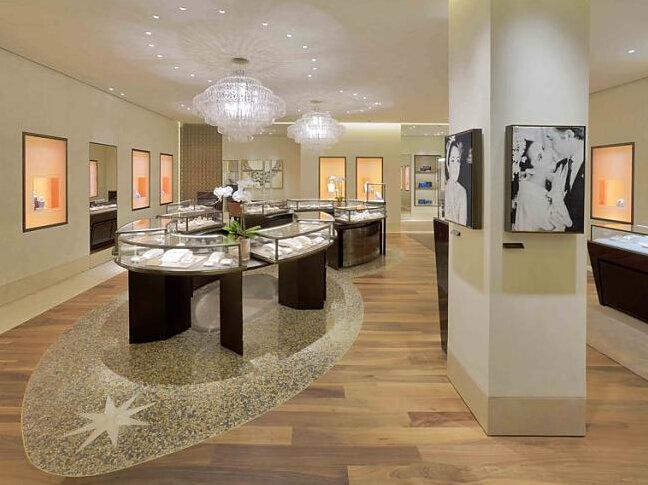 优雅的休息室是以罗马旗舰店「伊莉莎白泰莱休息室」的魅力所复制的。休息室之名取自 「IL Salottino Taylor」,亦即想当年伊莉莎白泰莱等好莱坞女星在这个私人专区待了无数的快乐时间,并利用这所意大利宫殿的「神秘门」 避开记者的追访。这里古董风格的扶手椅(灵感来自 Osvaldo Borsani),缟玛瑙所造的椭圆形咖啡桌,加上厚重精美的地毯,完美衬托出 1960 年代气氛。休息室的圆拱形天花板配以凹凸格纹,令人想起罗马万神殿穹顶,顶端镶有背光式 Muran 镜面,营造出阳光穿透罗马建筑物的光线效果。男士腕表区则是另一番风情。建筑师在此烘托出阳刚气息,找回19世纪西方国家绅士俱乐部的氛围。此处色调则较深重,从深灰、青铜以至墨绿,墙面则饰以绿色 Scagliola 烧涂效果。